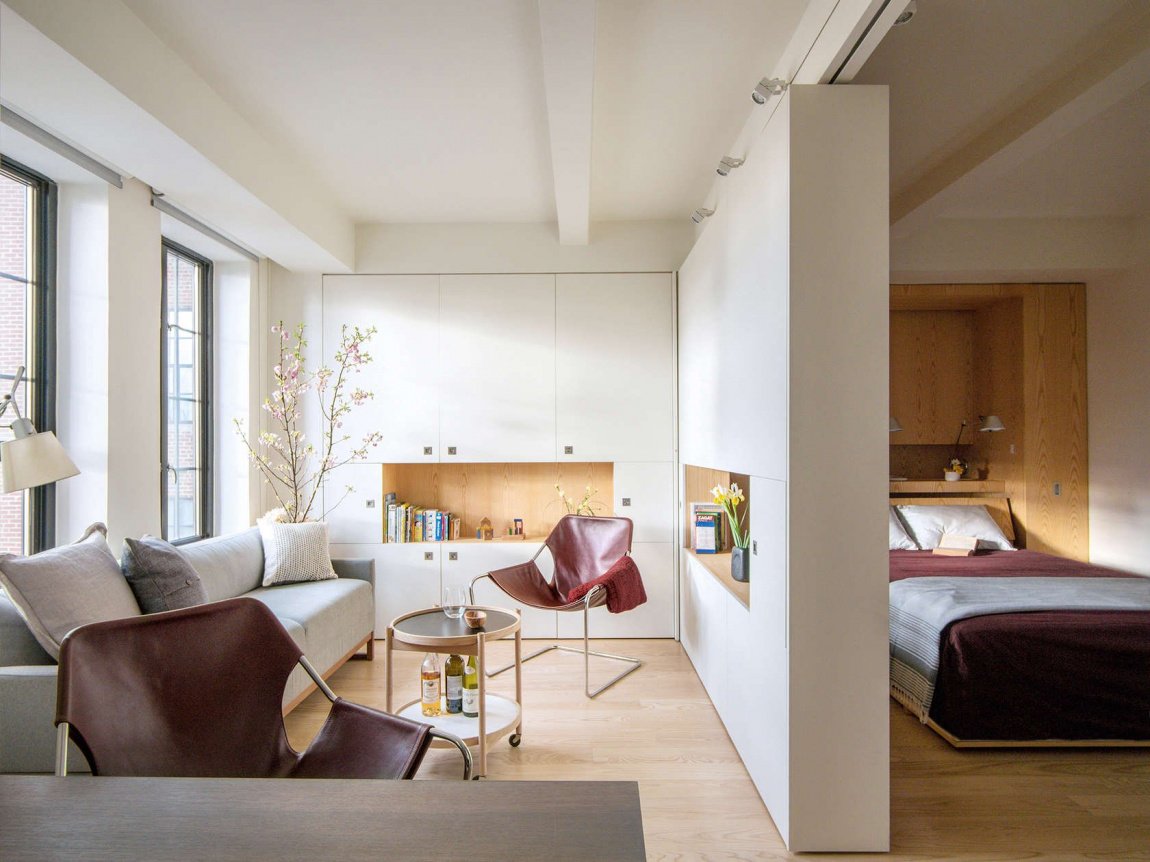 Schiebetüren aus Milchglas oder geriffeltem Kunststoff bieten den perfekten Kompromiss zwischen Privatsphäre und Offenheit. Bei Besuch können Sie die Tür vollständig öffnen und so den Raum optisch vergrößern. Und abends öffnet sich beim Schließen der Tür zum Schlafbereich ein voll funktionsfähiges Zimmer. In Deutschland sind deckenmontierte Systeme ohne Bodenschwelle beliebt – sie sind sicher für Kinder und Senioren und beeinträchtigen nicht die Funktion eines Saugroboters. Strukturiertes Glas, auch „Schneeballglas“ oder „Vermiculitglas“ genannt, verbirgt den Inhalt eines begehbaren Kleiderschranks, lässt aber genügend Licht herein, sodass Sie morgens keine Lampe einschalten müssen.